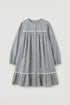 傘狀洋裝以有機棉製成,輕盈舒適。裙身為蛋糕層次設計,每層夾車金蔥流蘇,閃耀俏皮光澤。搭配圓領與鬆緊袖口,好穿好動,甜美中帶點華麗感。